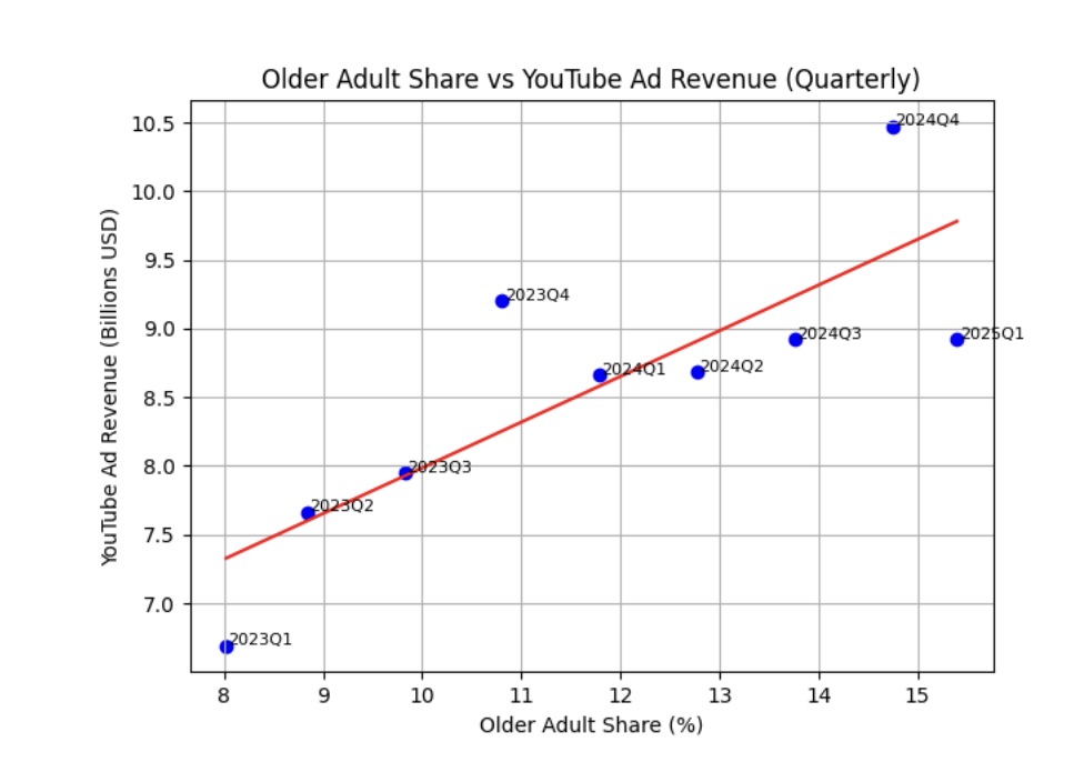 But what influence has this cohort really had? One way to uncover this is by looking into YouTube revenues, specifically, their ad revenue. As more people watch videos, YouTube profits off the ads embedded around these videos. My regression analysis of Alphabet’s quarterly earnings from 2023 to 2025, using an interpolated linear trend between the February 2023 and February 2025 viewership shares for adults sixty-five and older reported by Nielsen, shows a clear positive relationship between this group’s share of the overall audience and YouTube’s ad revenue. For every 1 percent increase in the proportion of YouTube’s total viewership accounted for by adults sixty-five and older, the platform’s ad revenue has risen by roughly $0.33 billion. While the correlation is not strong enough to claim that older adults are the sole driver of revenue growth, the trend is unmistakable: as their share of viewership rises, so does YouTube’s income. Now correlation does not mean causation; there are multiple factors accounting for YouTube’s rising revenue including the use of AI targeting, new product verticals like YouTube shopping, TV and sports/media rights, expanding creator economy, subscriptions, and advertising overall. What this does mean is that if older adults are claiming a larger slice of the audience, YouTube will inevitably seek to monetize that shift to keep revenues high. This group is taking over the platform faster than any other demographic, and YouTube is likely to capitalize on this surge. The question, however, is whether the platform’s push to capture this audience will repeat the same cycle of harm we have already seen with younger viewers’ mental health.